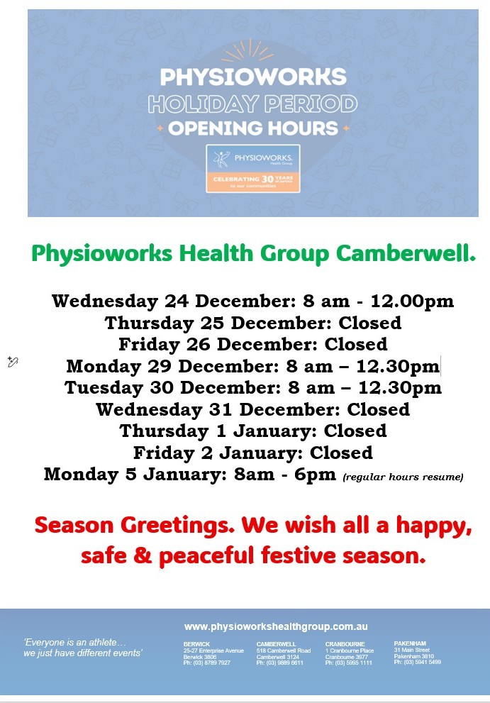 Physioworks Camberwell Holiday Season Opening Hours.